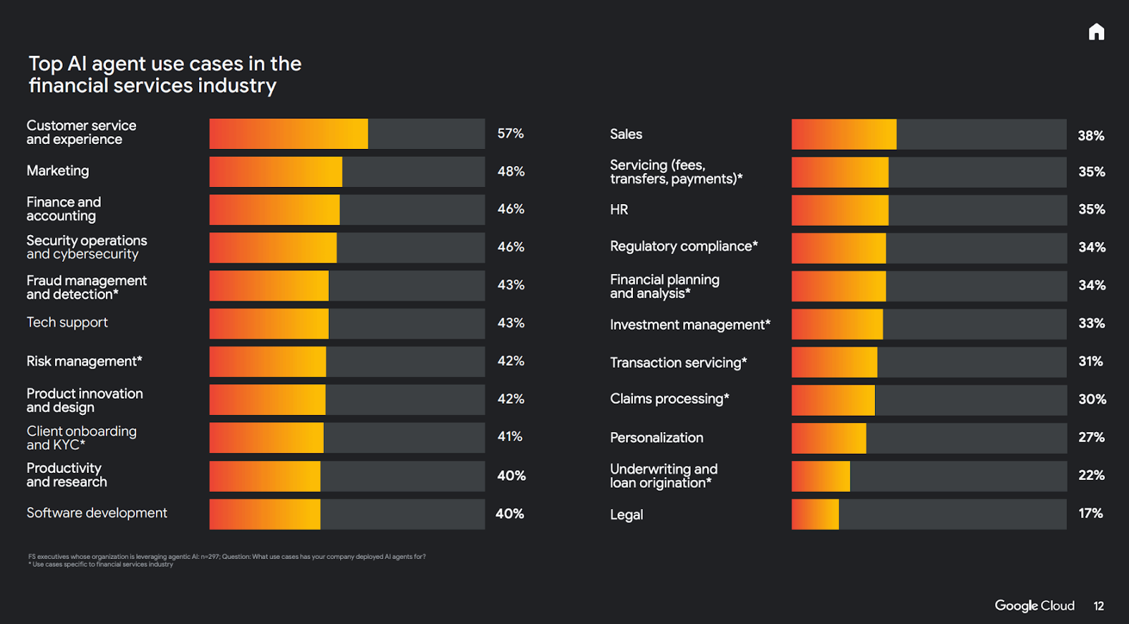 To no surprise to anyone, the finance industry (like tech, healthcare, and every other sector in the world) is also using artificial intelligence to improve customer experience. Google Cloud’s report about ROI of AI in financial services also found improving customer experience via AI agents as the top use case.