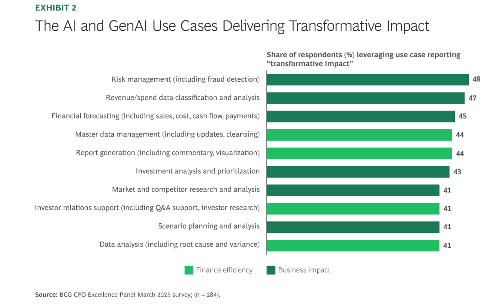- The wrong use cases get prioritized. Most teams focus on internal efficiency—payables, receivables, policy drafting, and coding. These are faster to implement but deliver modest returns. BCG’s data shows the highest-ROI use cases are in risk management and financial forecasting—areas many firms haven’t even started exploring with AI.