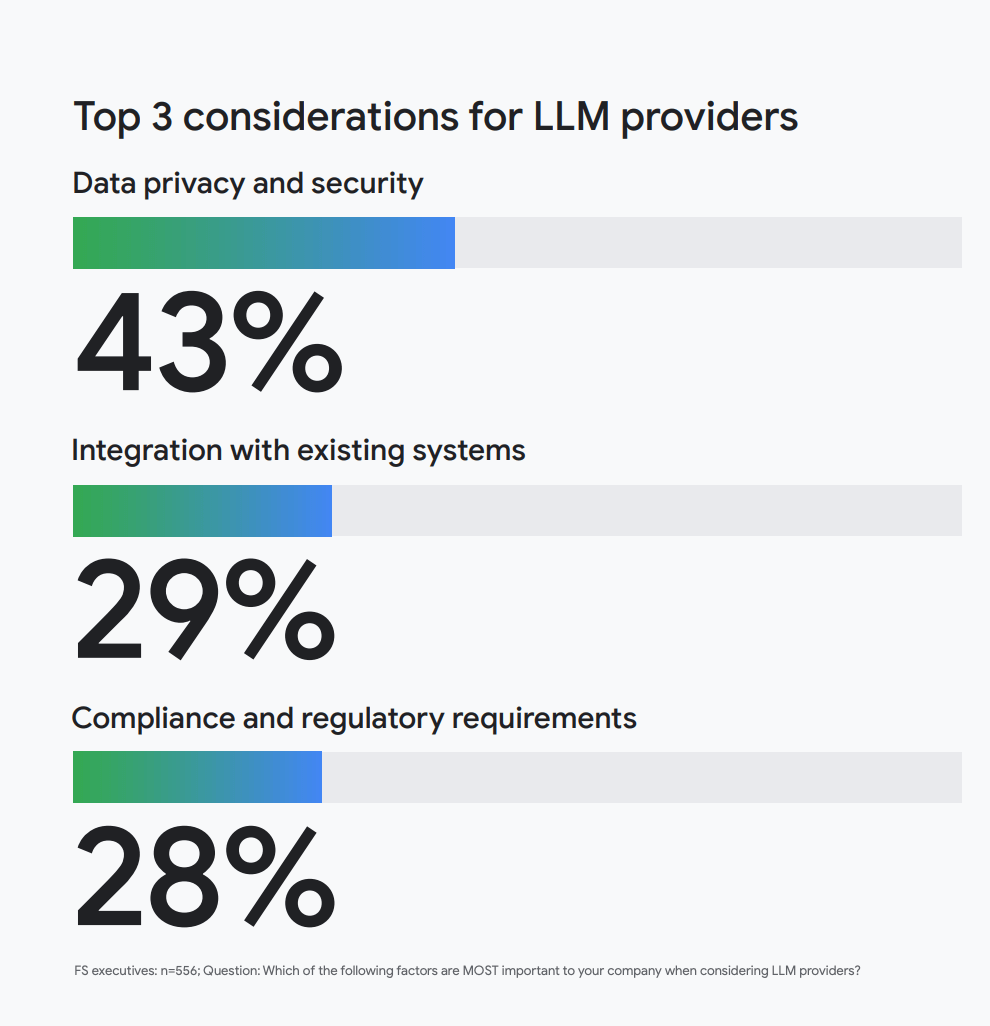 - Compliance, regulation, and auditability slow everything down. Finance teams face more implementation hurdles than other functions. Google’s research tracks with this—data privacy, compliance, and integration with existing systems are the key challenges of implementing AI in financial services.