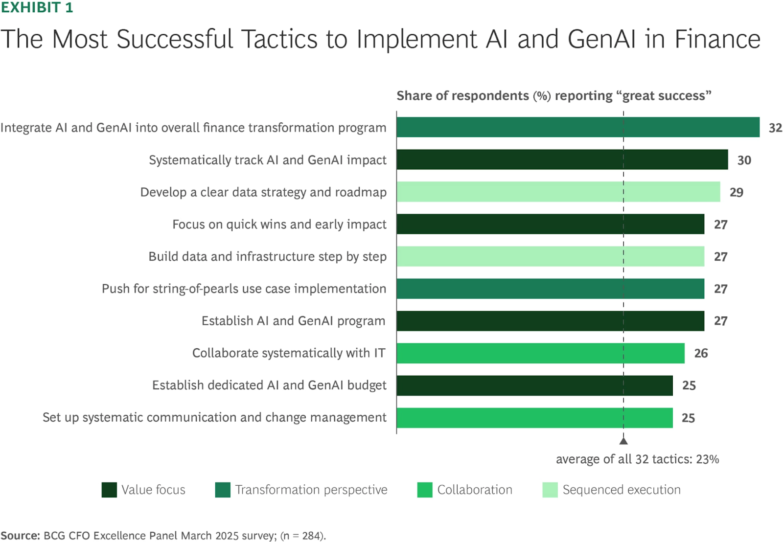 - Too many disconnected pilots, not enough scaled deployments. The typical finance function has six use cases in proof-of-concept and five in production. But few have more than ten active total. BCG found that teams that embed AI into their overall finance transformation increase their probability of success by 7% over those running scattered pilots.