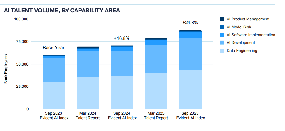 If this sounds like all hope is lost, hold your breath. AI is also adding more jobs. While overall banking headcount declined 3% between 2023 and 2025, AI-specific roles grew from 60,000 to nearly 80,000. The largest banks increased their AI talent pool by 13% in just six months—the biggest jump in two years.