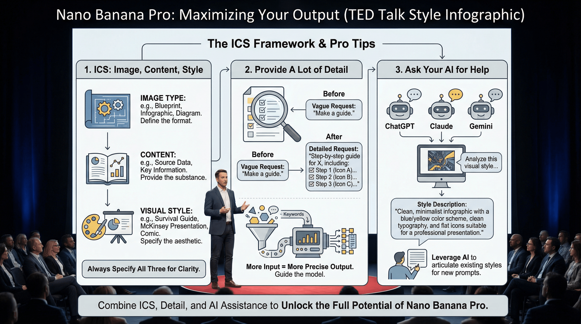 - ICS - Image, content, style. Always specify the image type (e.g., blueprint, infographic, diagram), content (source data or information), and visual style (e.g., survival guide, McKinsey presentation, comic)
