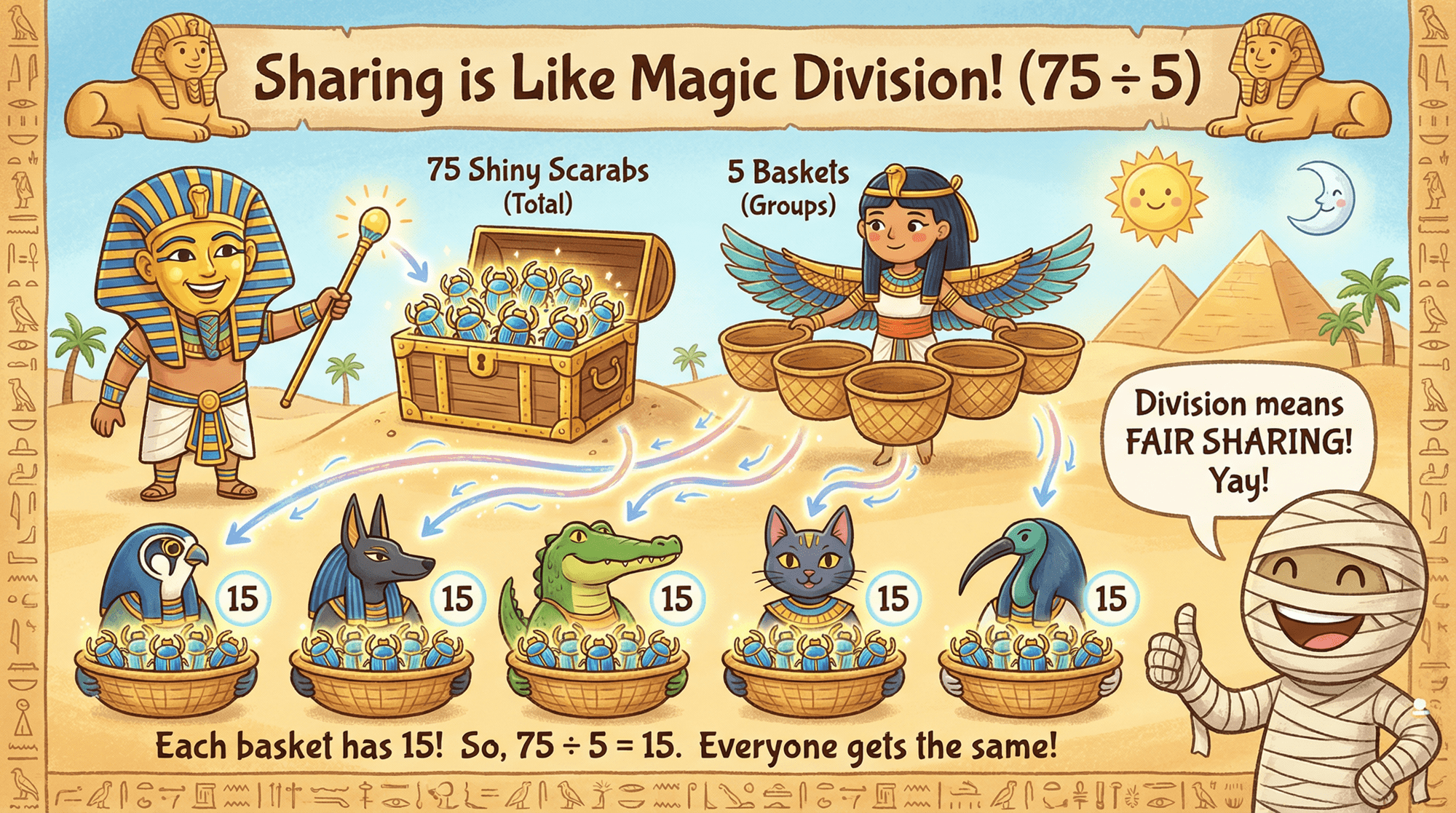 Create a slide to help first graders learn the basic concepts behind division and go through the example of 75 divided by 5. Use a fun cartoon Egyptian theme to engage the students.