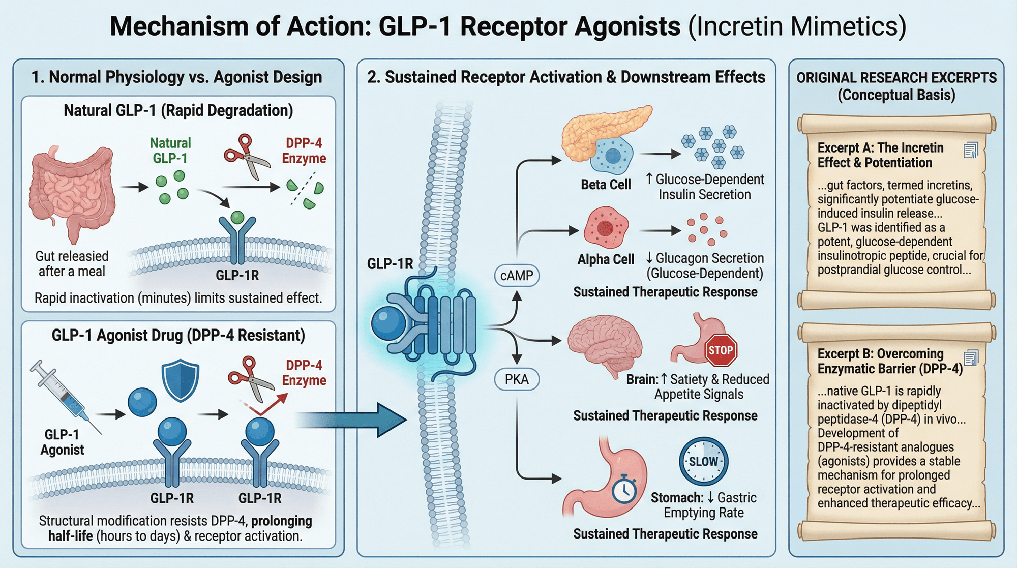 Create a slide explaining the mechanism of action behind GLP-1 drugs. Use scientific illustrations to show how they work and include excerpts from the original research behind the GLP-1 agonists.