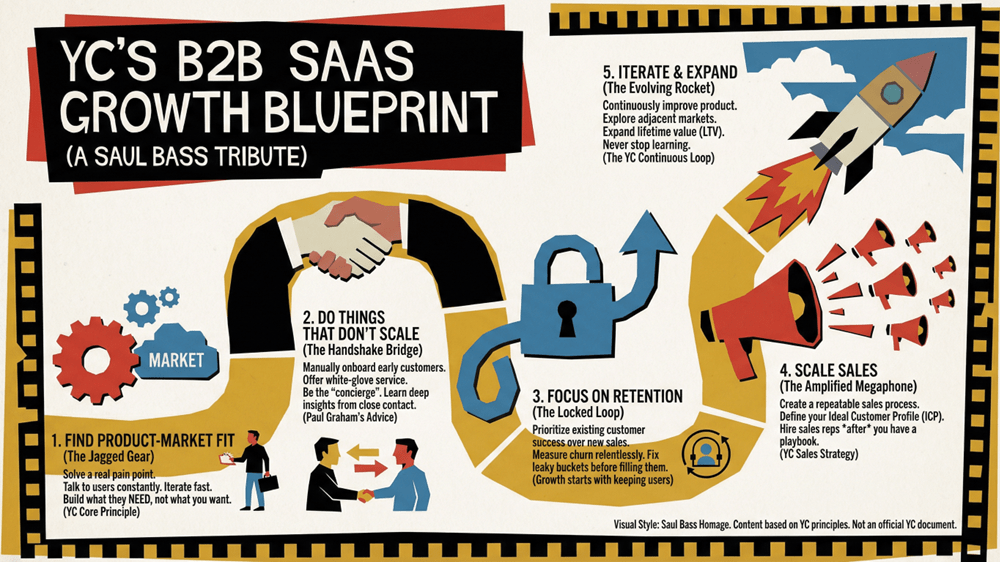 Create an infographic illustrating YC’s B2B SaaS startup growth advice presented in Saul Bass style