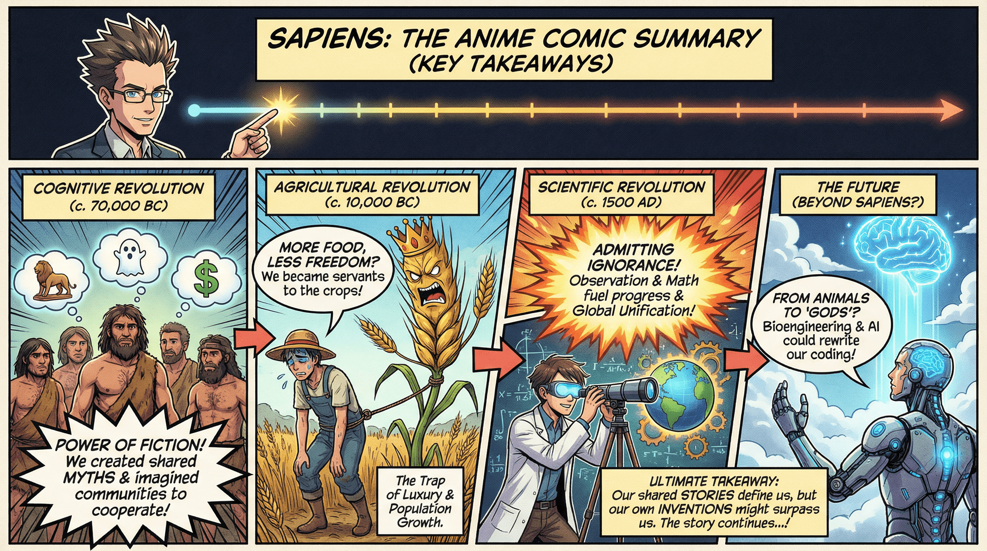 Create an infographic summarizing the key takeaways from Sapiens presented in an anime comic book style
