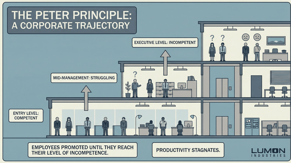 Create a detailed diagram illustrating the Peter Principle at work at a large company in the style of a Severance illustration.