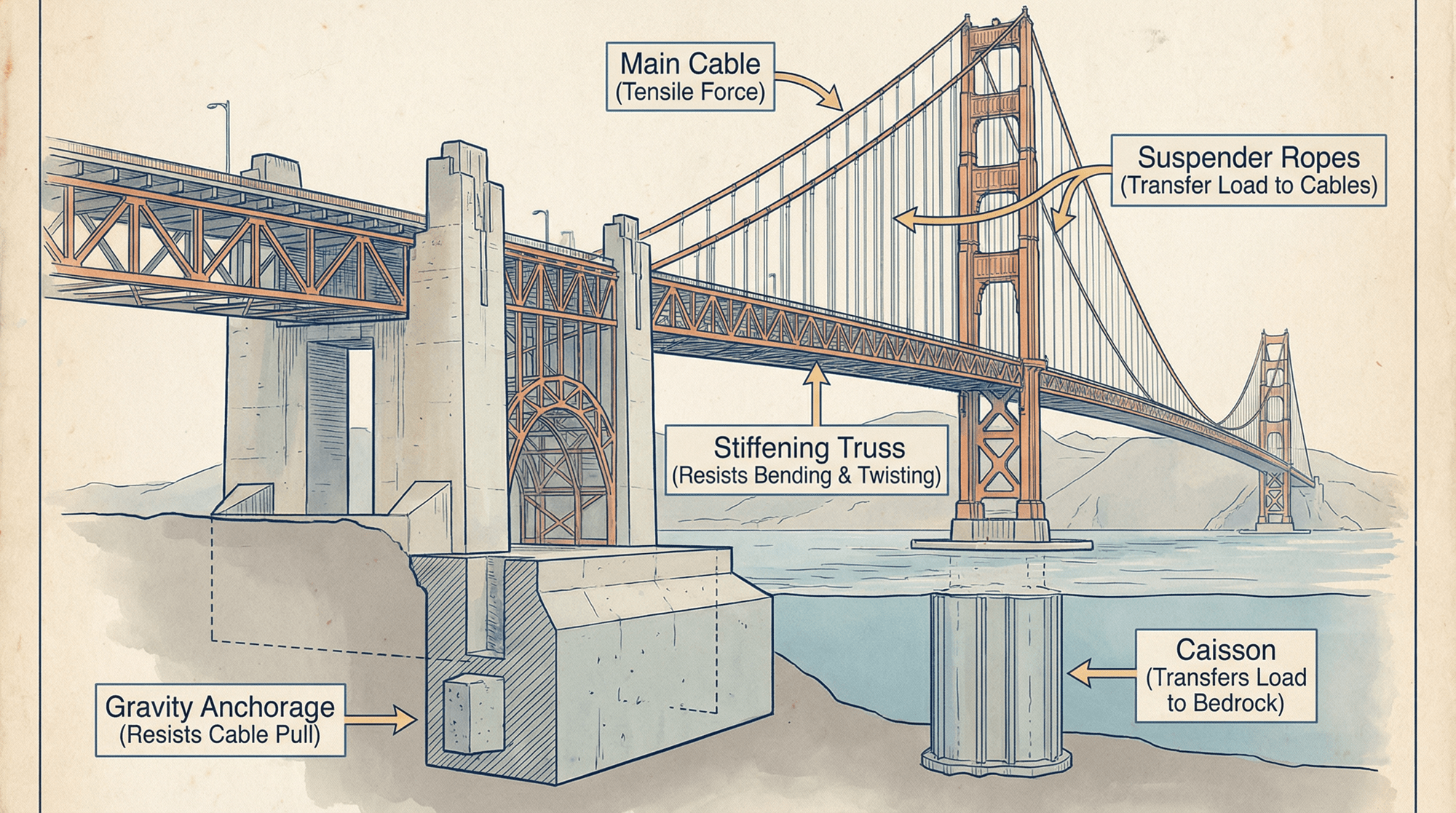Detailed cross-section of the Golden Gate Bridge showing key engineering principles behind the construction of the bridge