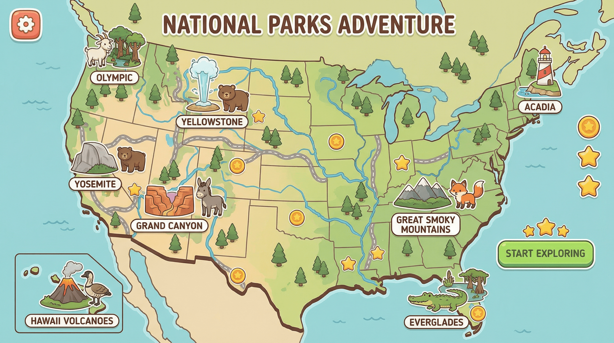 Map of the United States highlighting key National Parks illustrated in the style of a cute mobile game