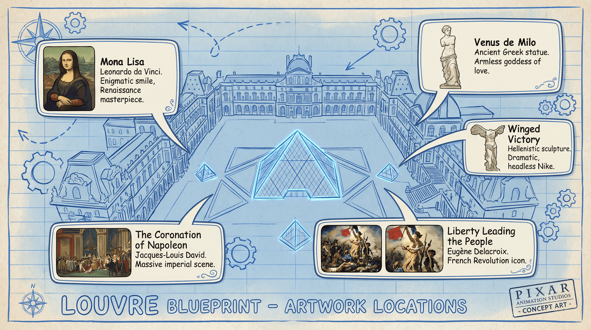 Blueprint of the Louvre showing the locations of key pieces of artworks. The blueprint should be in a pixar cartoon style with callout boxes showing a brief description of each of the key artworks.