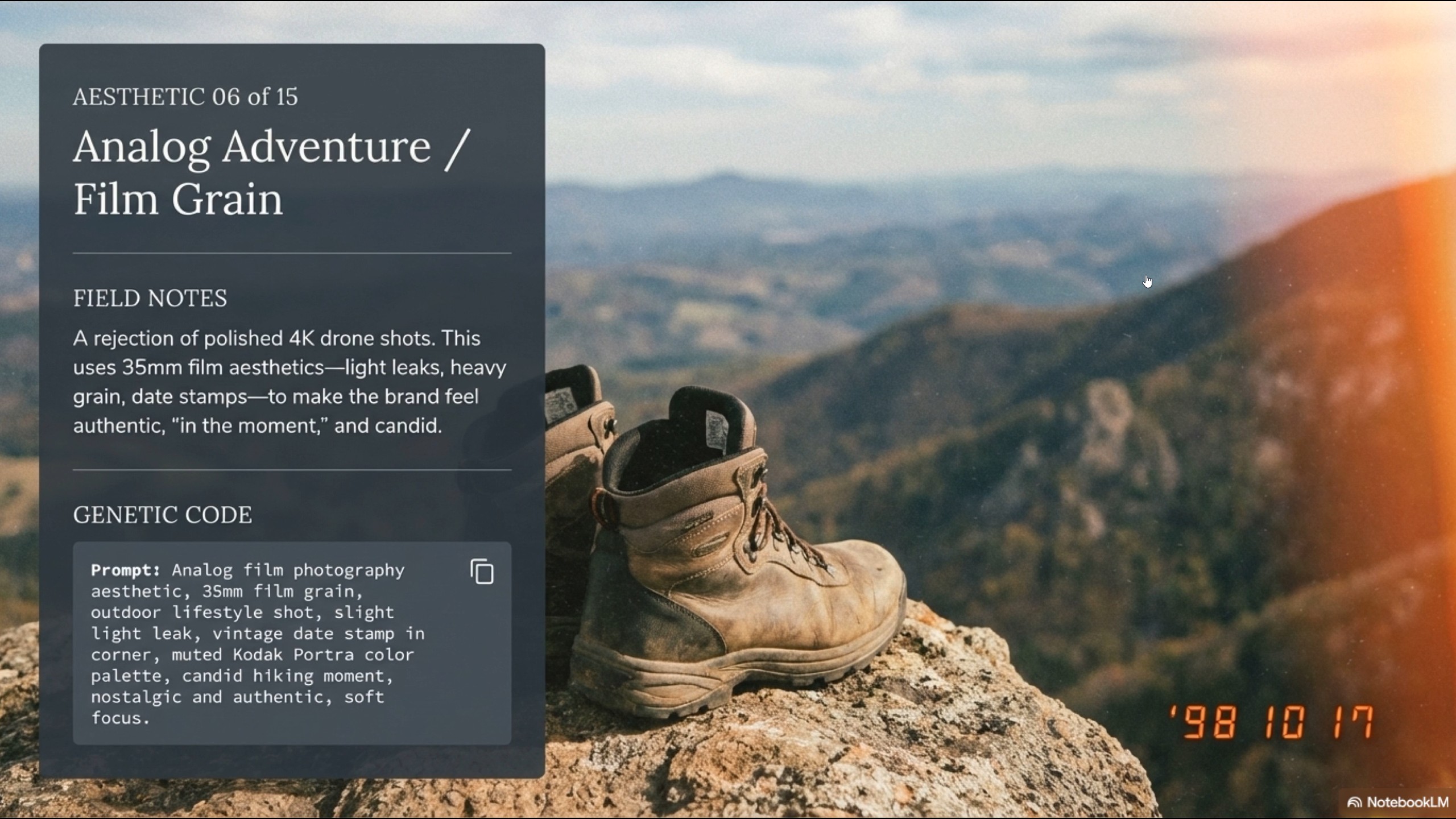- Analog Film Grain: Analog film photography aesthetic, 35mm film grain, outdoor lifestyle shot, slight light leak, vintage date stamp in corner, muted Kodak Portra color palette, candid hiking moment, nostalgic and authentic, soft focus.