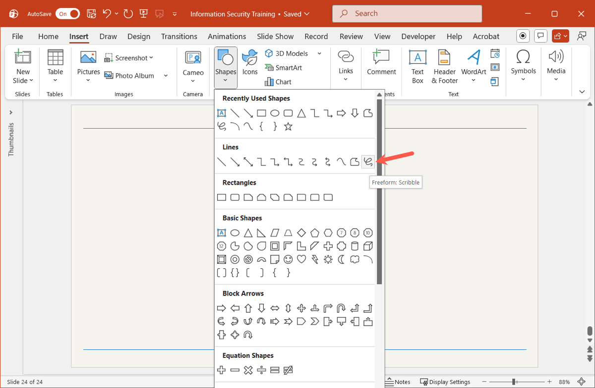 - Open the Shapes menu and select Scribble in the Lines section of the menu.