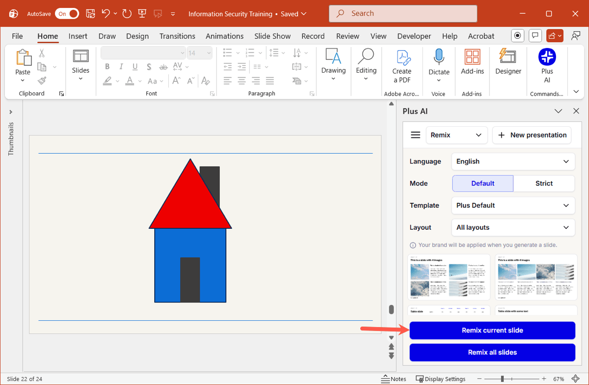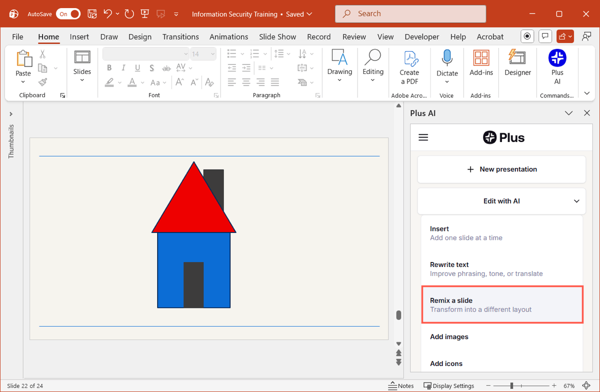 Once you create your drawing, you may want to enhance it or make a better fit for it on your slide. Using the Plus AI add-in for PowerPoint, you can take advantage of the Remix feature to transform your drawing.