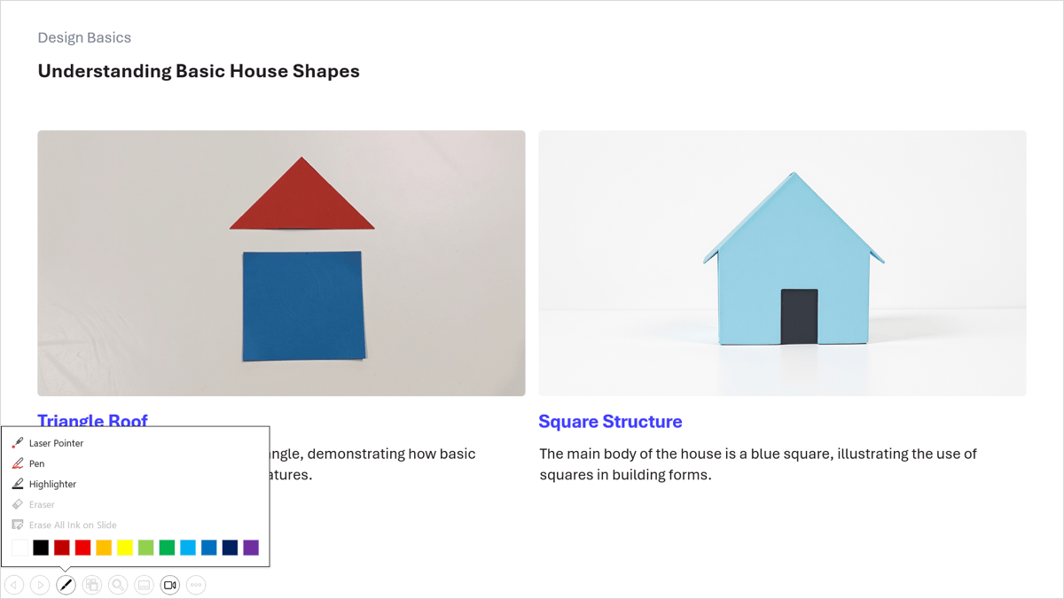 You’ll see your slide update based on your drawing. Keep in mind that the results depend on the drawing you use. For instance, if you sketch a cloud, you can receive content about clouds or if you draw a house, you may see details about housing or house design.