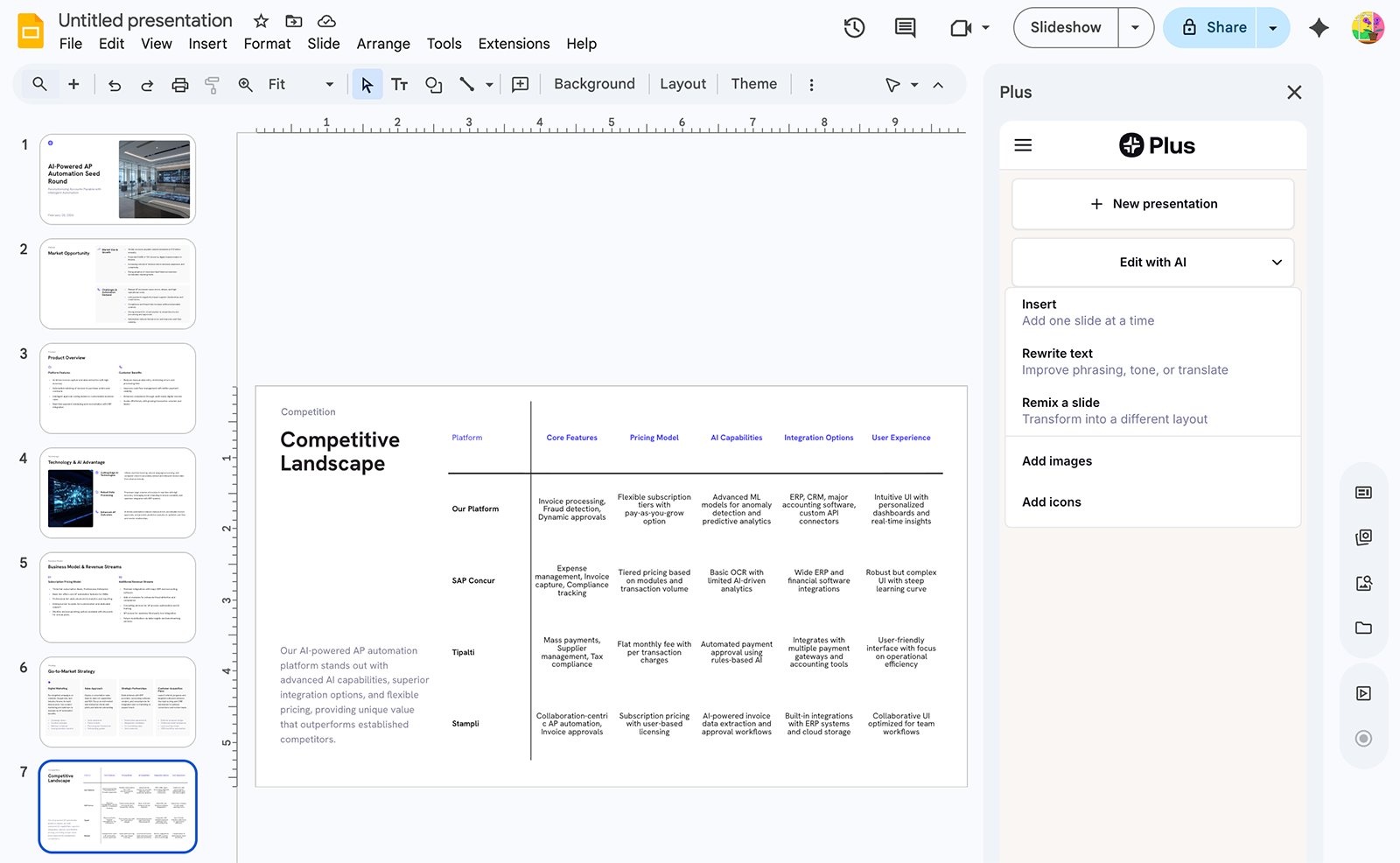 You can use Plus AI's editing tools to refine presentations directly in Google Slides or PowerPoint. Rewrite text with AI, remix slides with one click, or add images and icons.