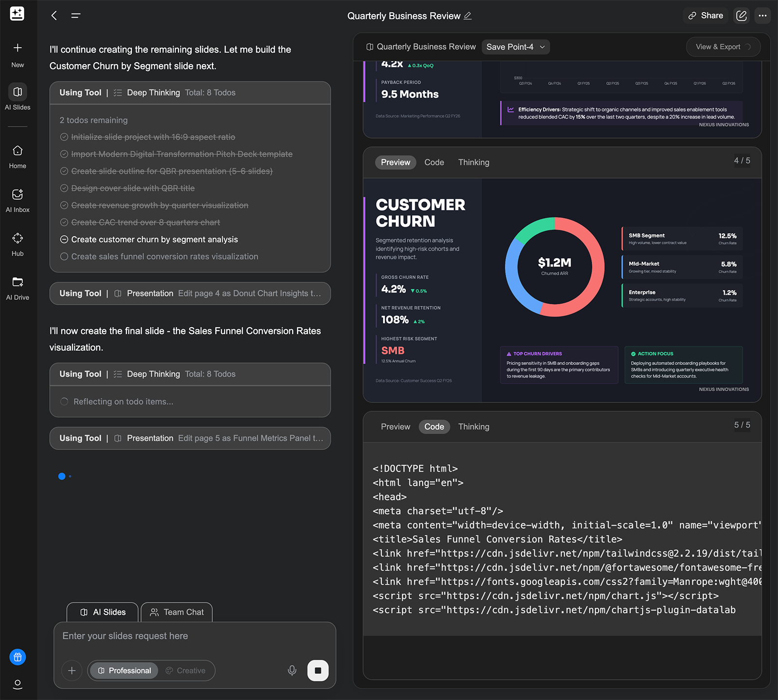 Plus AI is an AI presentation maker for generating and editing slides directly in the app, Google Slides, or PowerPoint. Designed for professional presentation creators, it supports building from scratch or starting from a prompt or a file (like a call transcript or an annual report).