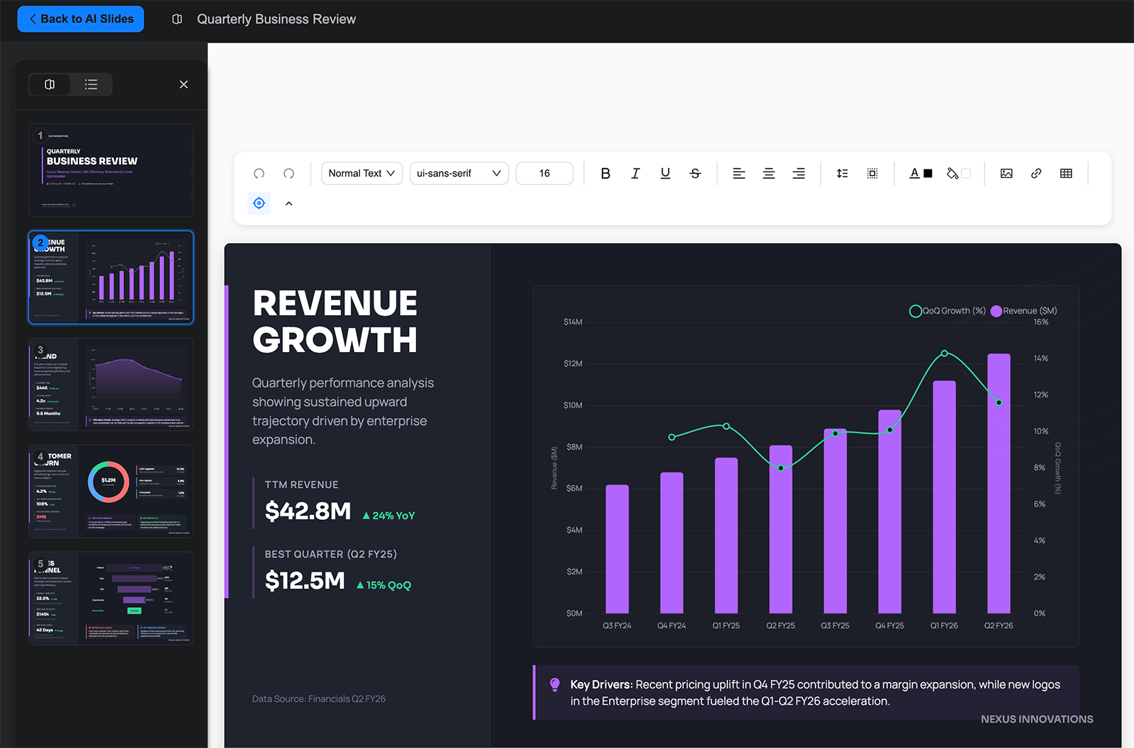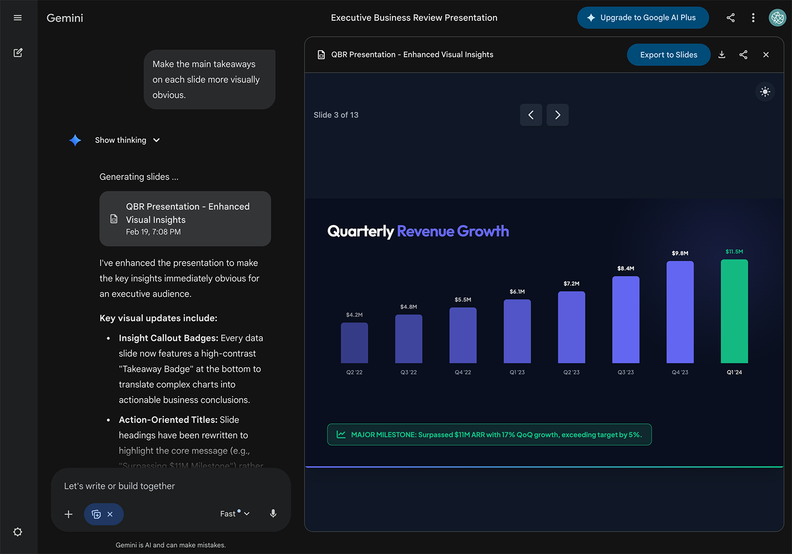 - It went above and beyond the basic prompt to create a quarterly business report, generating a strategic growth roadmap, highlighting key wins, and making the data highly visual.