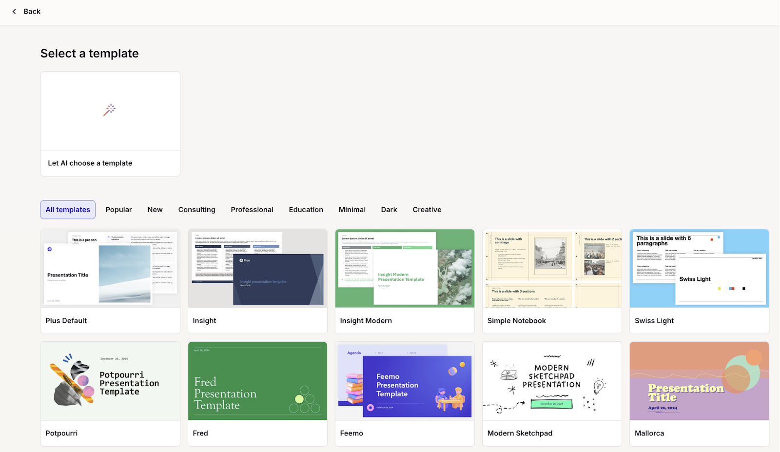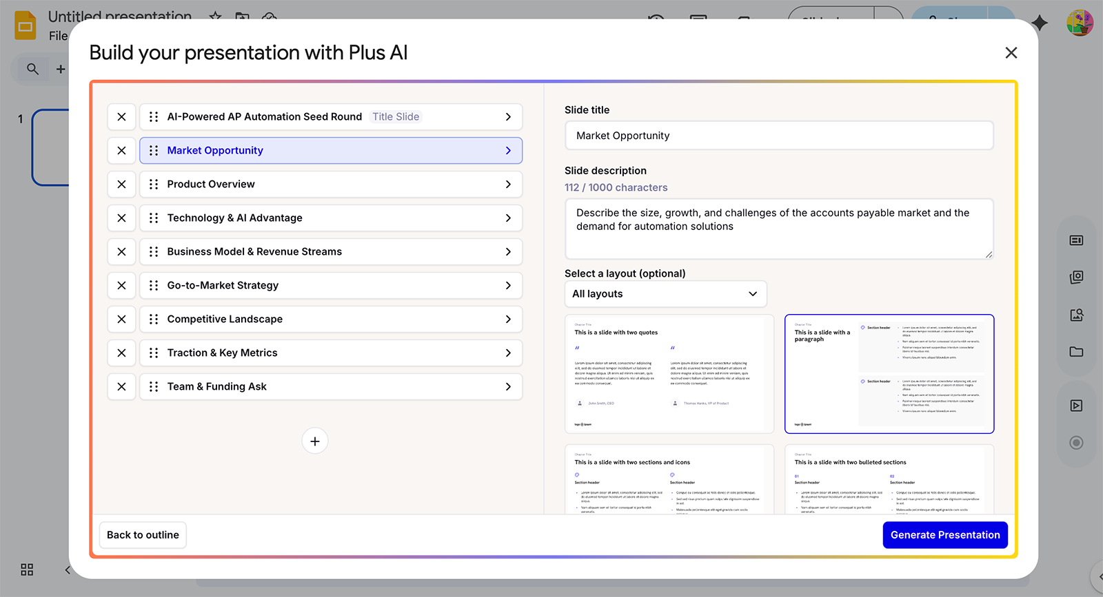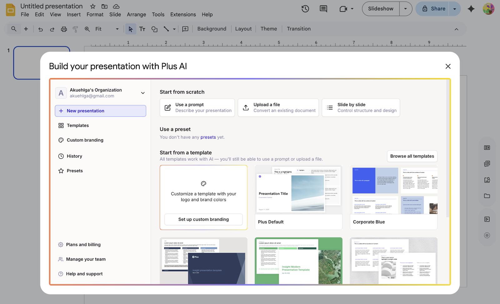 Choose from Plus AI's template library, upload your own, or let AI select one for you based on the information you provide. After you confirm the language, number of slides, and image source (AI-generated, web search, or stock), you generate an outline for review.