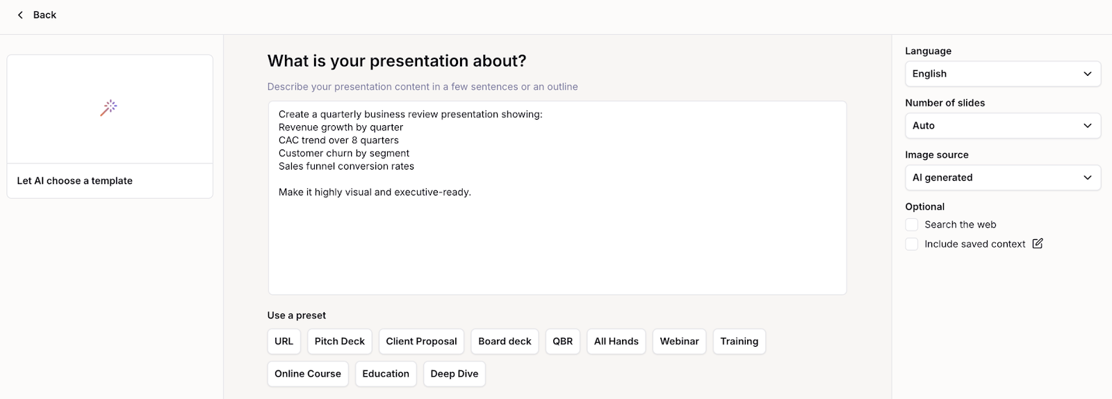 - Gemini didn't let me provide input on layout, visual, or branding preferences. This could be nice if you want an AI presentation tool that handles a lot of the decision-making for you.