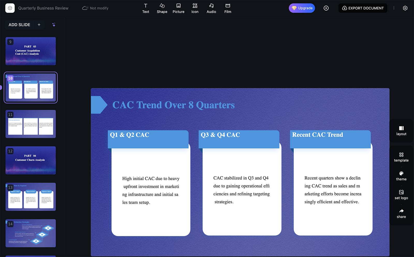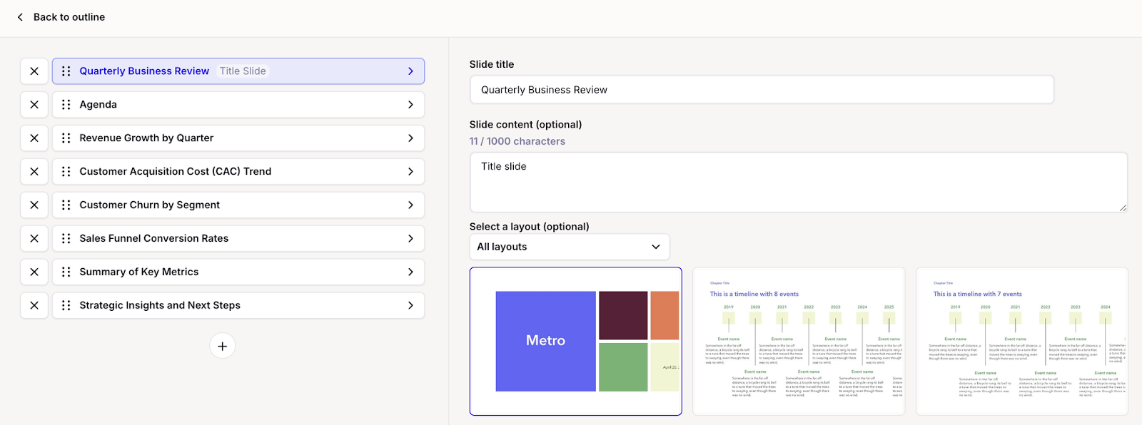 This is your opportunity to check the design, review the slide order, and add or remove any slides. You can also select a layout and update the slide content.