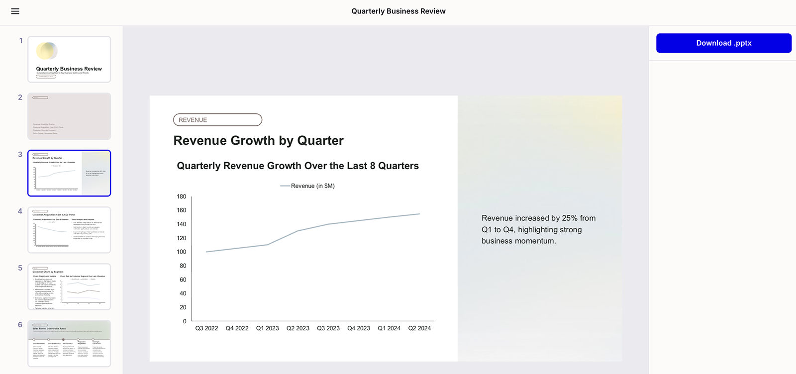 Then, Plus AI generates the deck for you to download and present. Unlike most other presentation tools, Plus AI creates real PowerPoint slides, not HTML converted to PPTX.