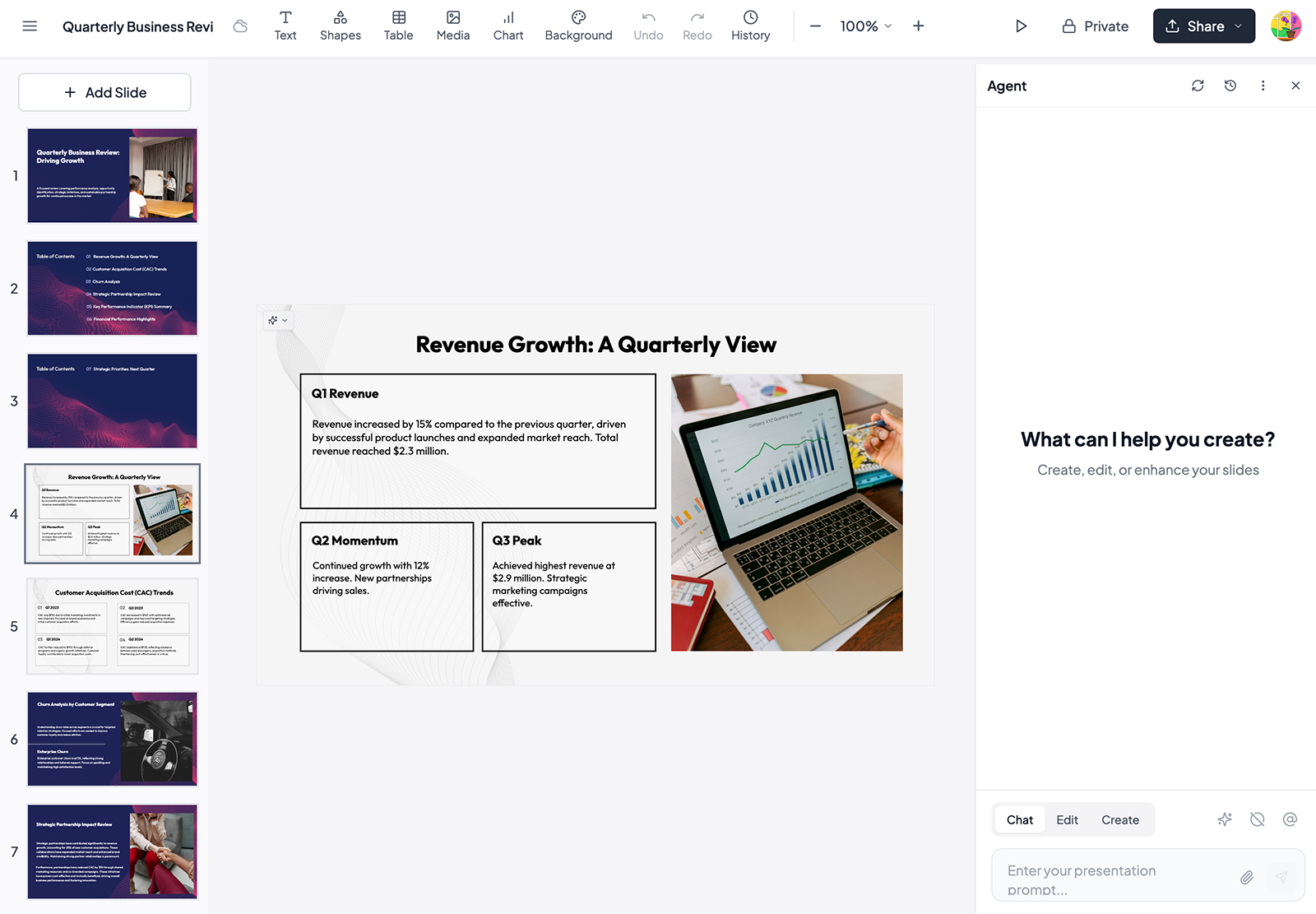 - It has helpful editing options, including a tool to update presentation copy and an AI assistant that you can chat with to revise the draft copy. Plus, it can regenerate slides based on your instructions.