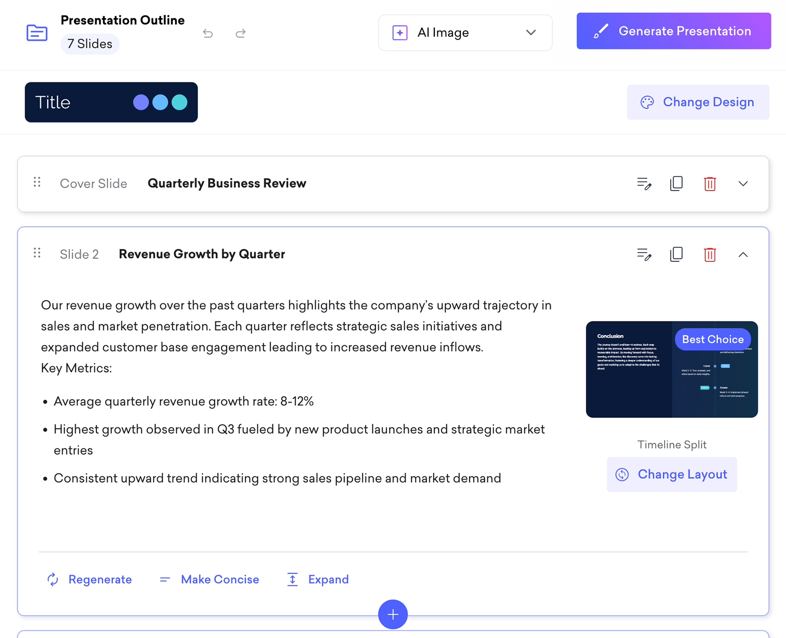 - The outline editor leaves a lot to be desired. You can chat with Beautiful.ai to revise the outline before creating the presentation, but you can't click to regenerate individual slides.
