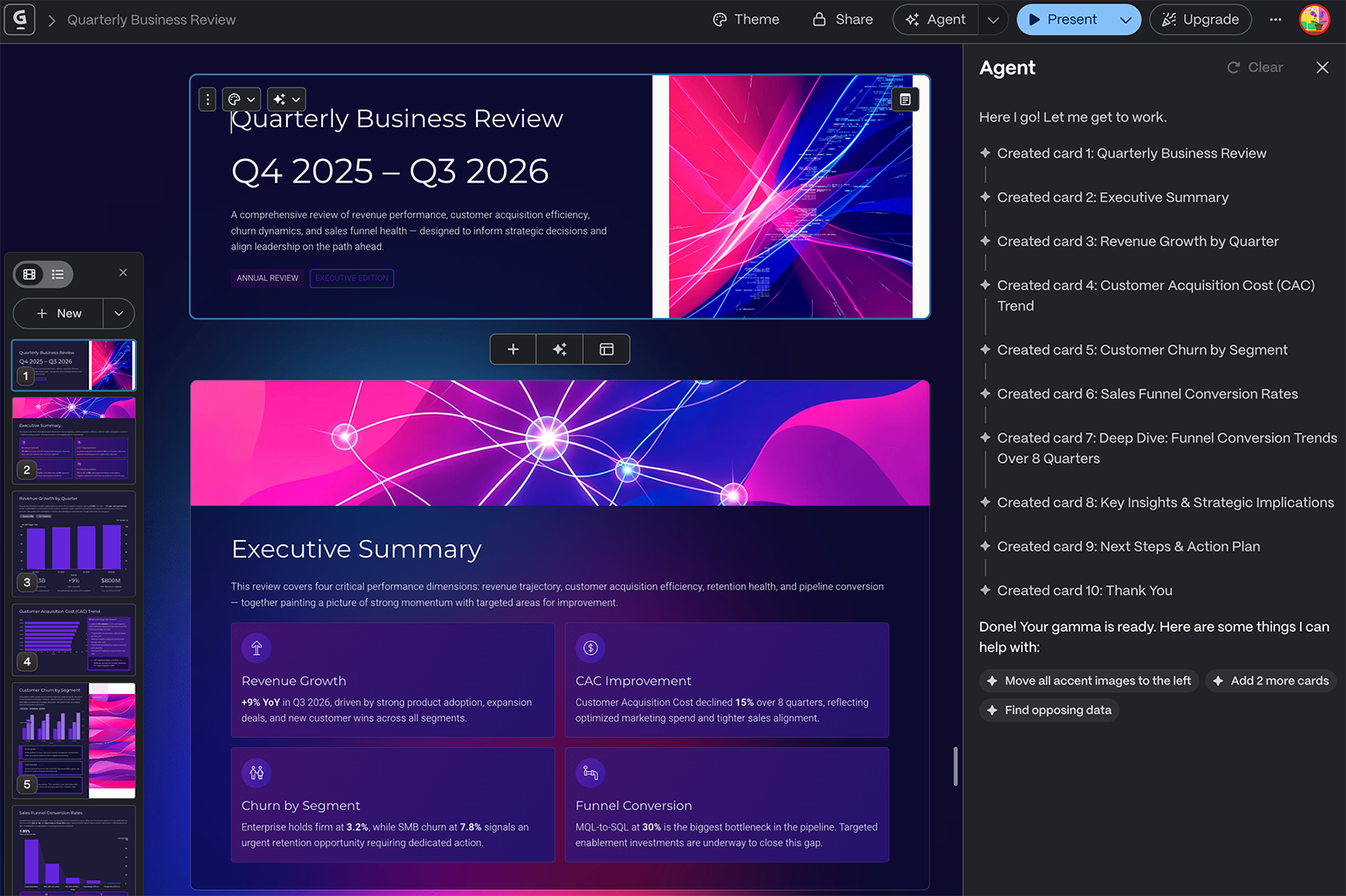 - Gamma generated more slides (all relevant and tailored to the prompt) than I requested, demonstrating that it's one of the better strategic partners out of all the tools on this list.