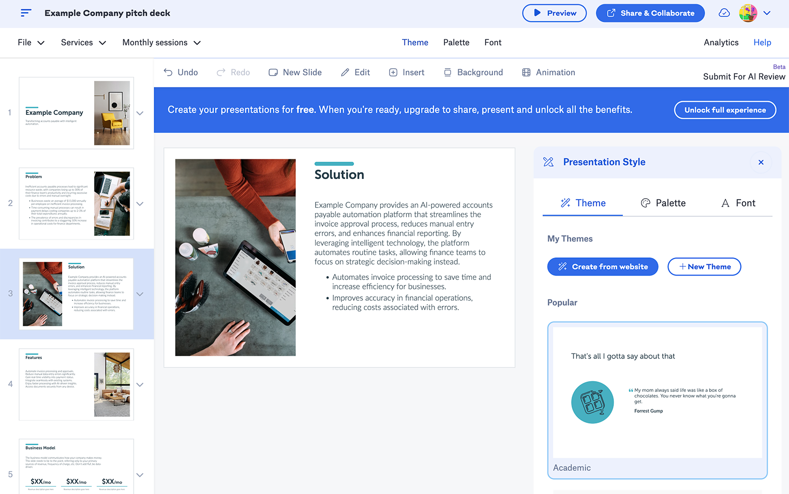 - Slidebean is less of an AI tool and more of a presentation tool. It has plenty of pitch deck templates you can use, but you have to input your company data and adjust the layout manually.