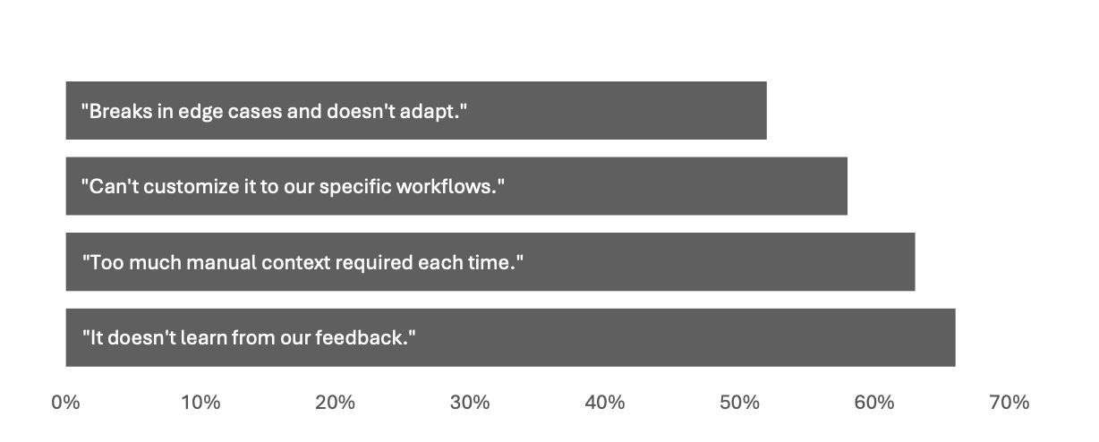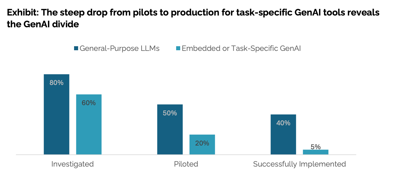 Part of the failure is in competing priorities: businesses need to continue running their core business while also investing in AI for the future. According to MIT’s report, external partnerships succeed 2x more often than internal builds (67% vs 33%) and trying to build your AI stack in-house is twice as likely to fail.