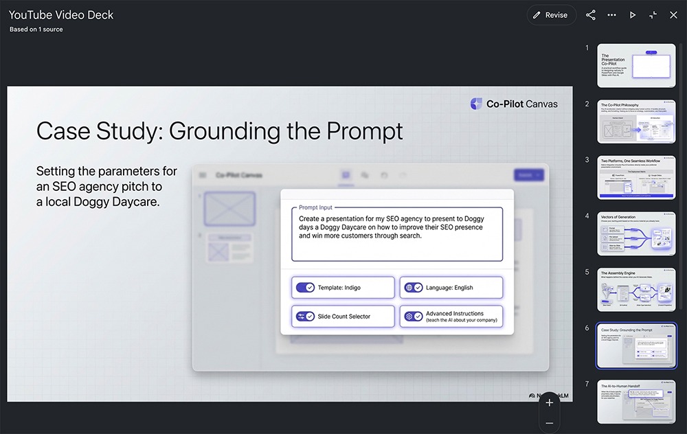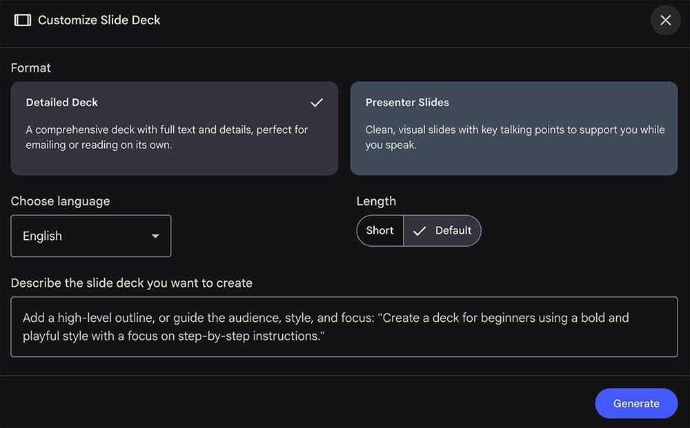 - Presenter slides: This AI tool can generate two different types of slide decks. Along with detailed slide decks, it can create simpler slides with talking points, designed for delivering presentations.