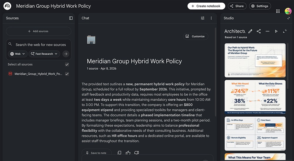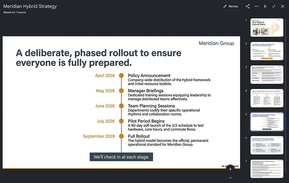As Google's Gemini-powered AI research assistant, NotebookLM is a tool for finding and synthesizing information. Its AI presentation tool is part of a broader feature set, and it generates slide decks based on the sources you upload or those it surfaces via research.