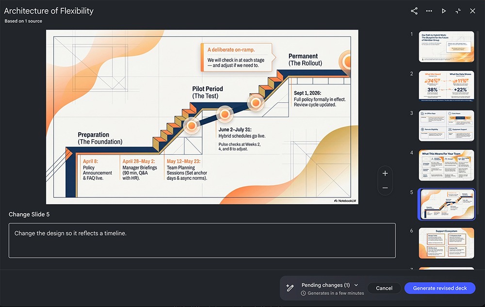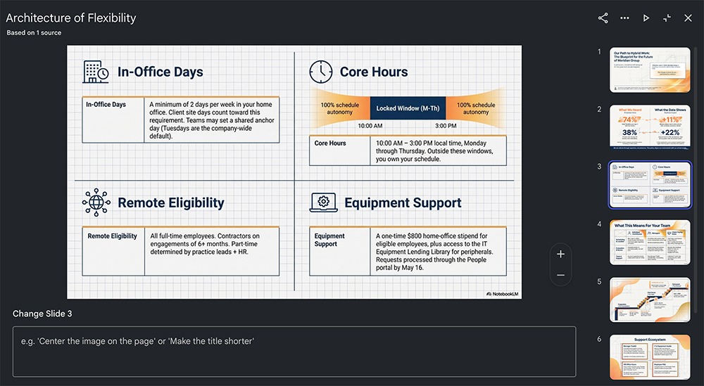 There's no quick way to regenerate a slide, rewrite the copy, or add or remove slides. And you can't do any manual editing in NotebookLM.