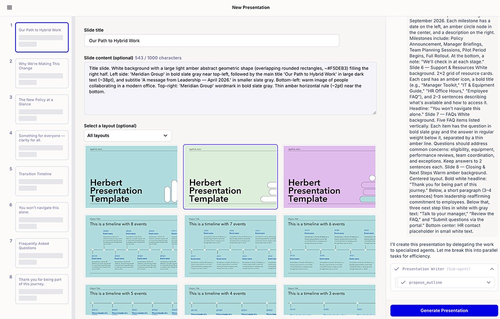 No matter which option you choose, you can select from Plus AI's template library, which includes over two dozen professional layouts. You can also generate images with your choice of AI model (including Nano Banana Pro and GPT Image), source from Lummi stock images, or find images on the web.