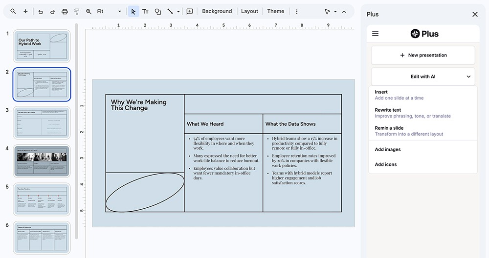 In comparison, Plus AI has both editing presets and prompt-based editing when you use the Google Slides or PowerPoint add-in. That means you can easily update the entire layout of your presentation, adjust specific elements on a slide, or edit manually.