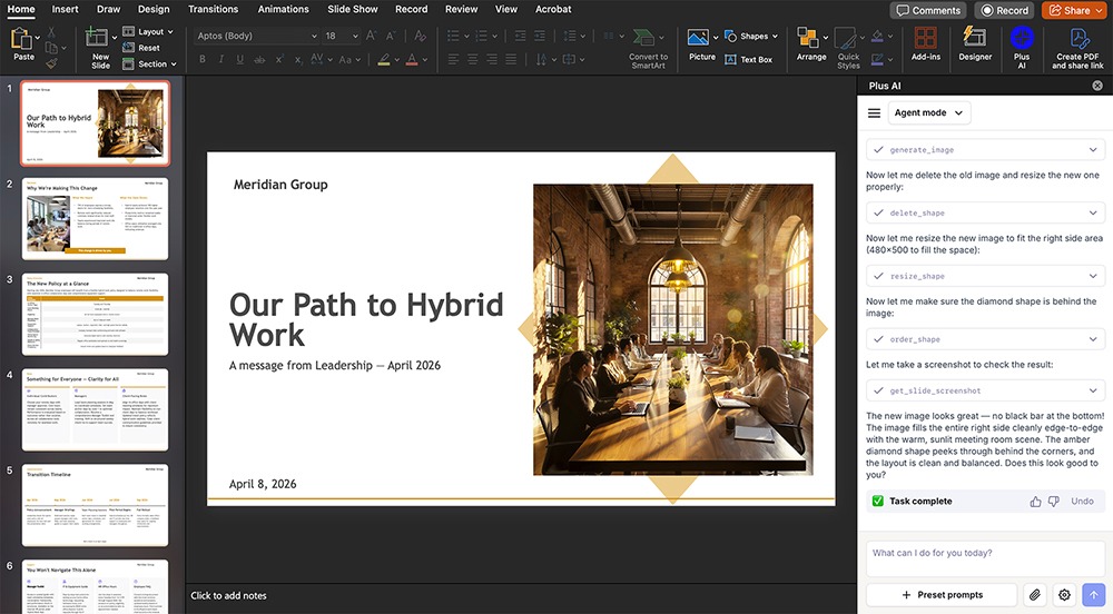 The Plus AI PowerPoint add-in supports the same presets as well as editing via Plus AI Agent. With the agent, you can edit via prompts, giving you more flexibility to get your slide deck just right.