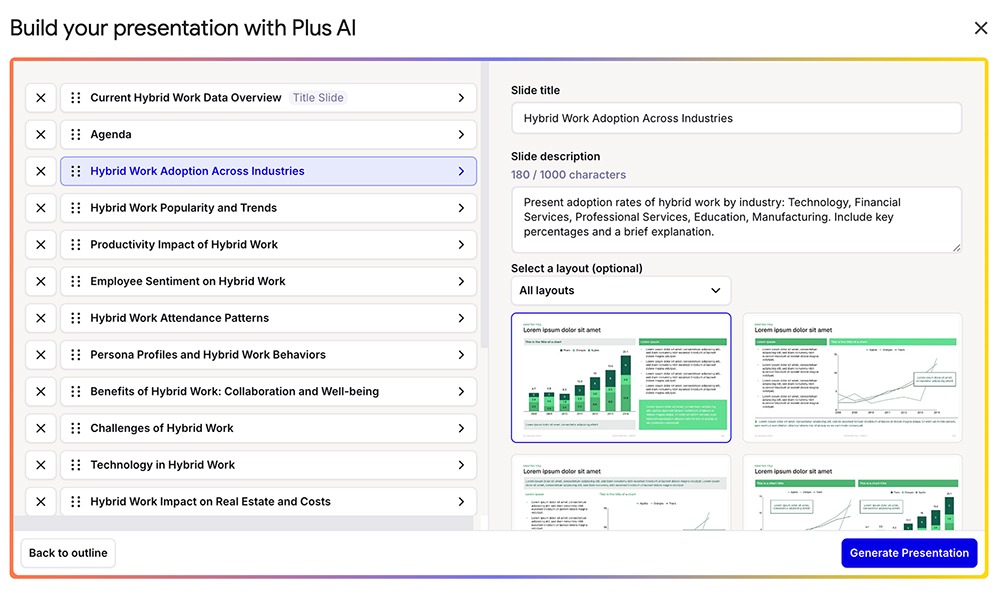 In contrast, Plus AI supports both prompt- and upload-based deck generation. It can also search the web for current data and sources. No matter which option you choose, you'll get an option to weigh in on the outline and guide the final product before you get to the editing stage.