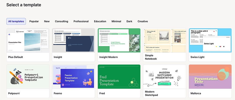 Plus AI provides professional templates to create slide decks for investor meetings, quarterly reports, client pitches, and much more. While the styles offer variety, most are designed for business.