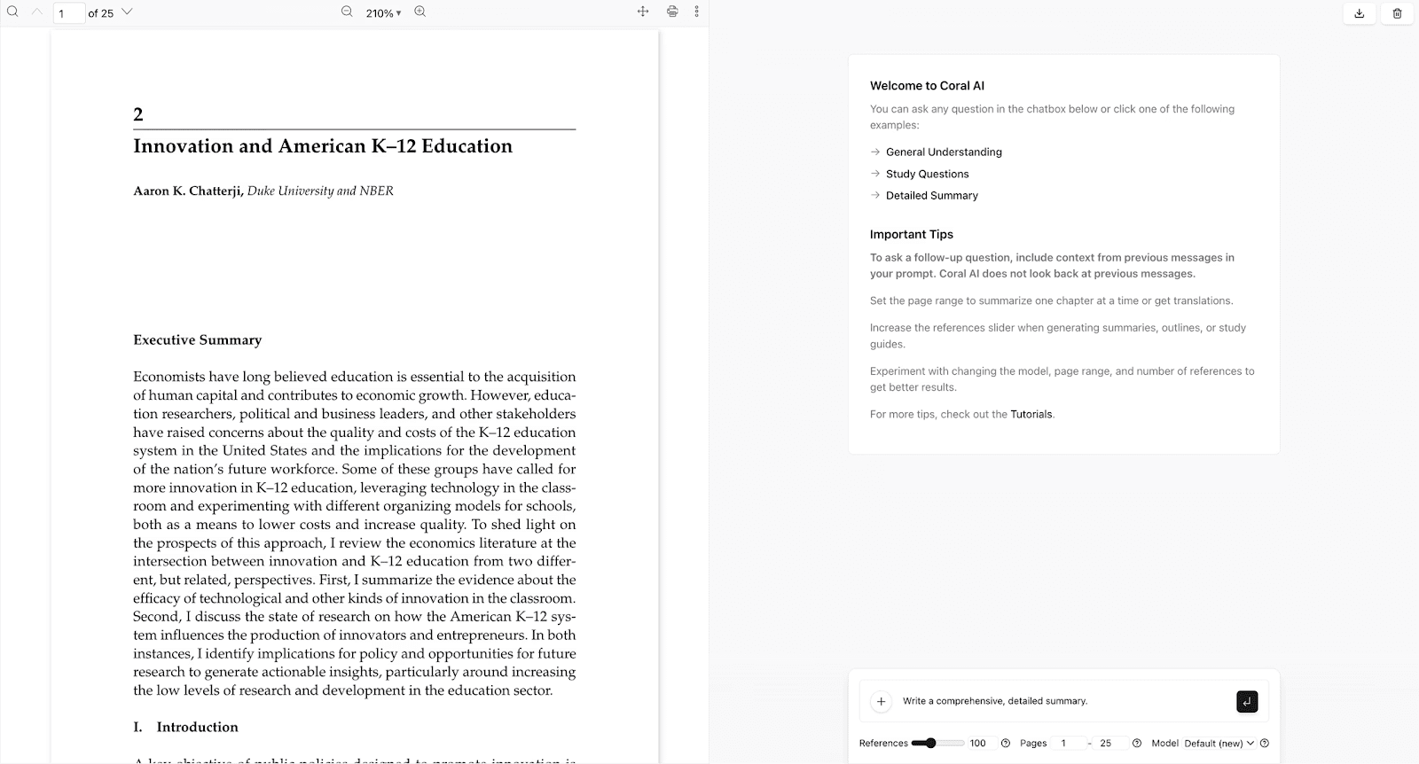Coral AI helps you chat with your PDFs. You can ask the tool to summarize the doc, find specific information, and even get citations.