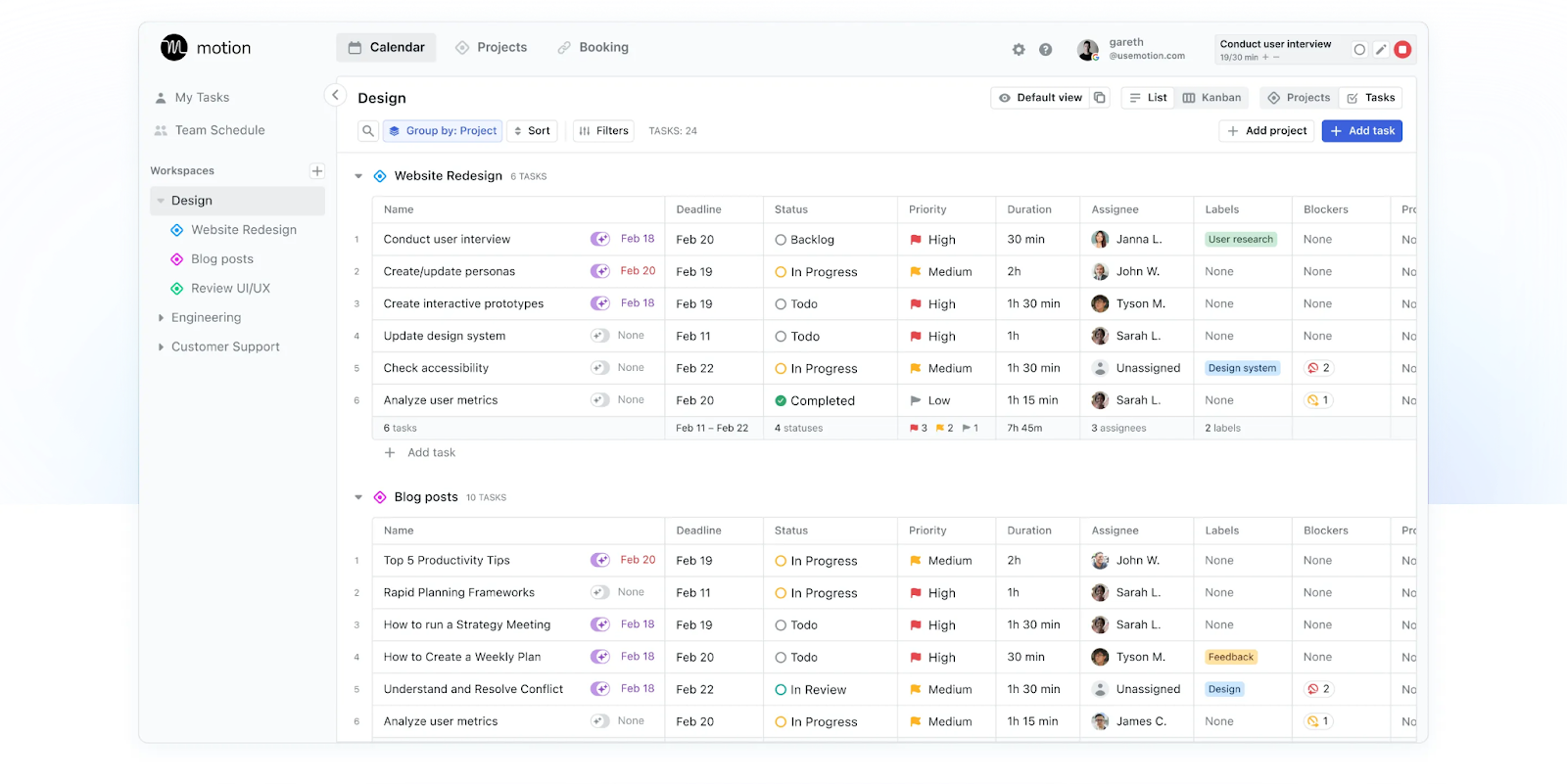 Motion automatically time blocks your to-do list and meetings on your calendar, so you know your schedule every workday. It can also turn hundreds of tasks into a concrete plan.