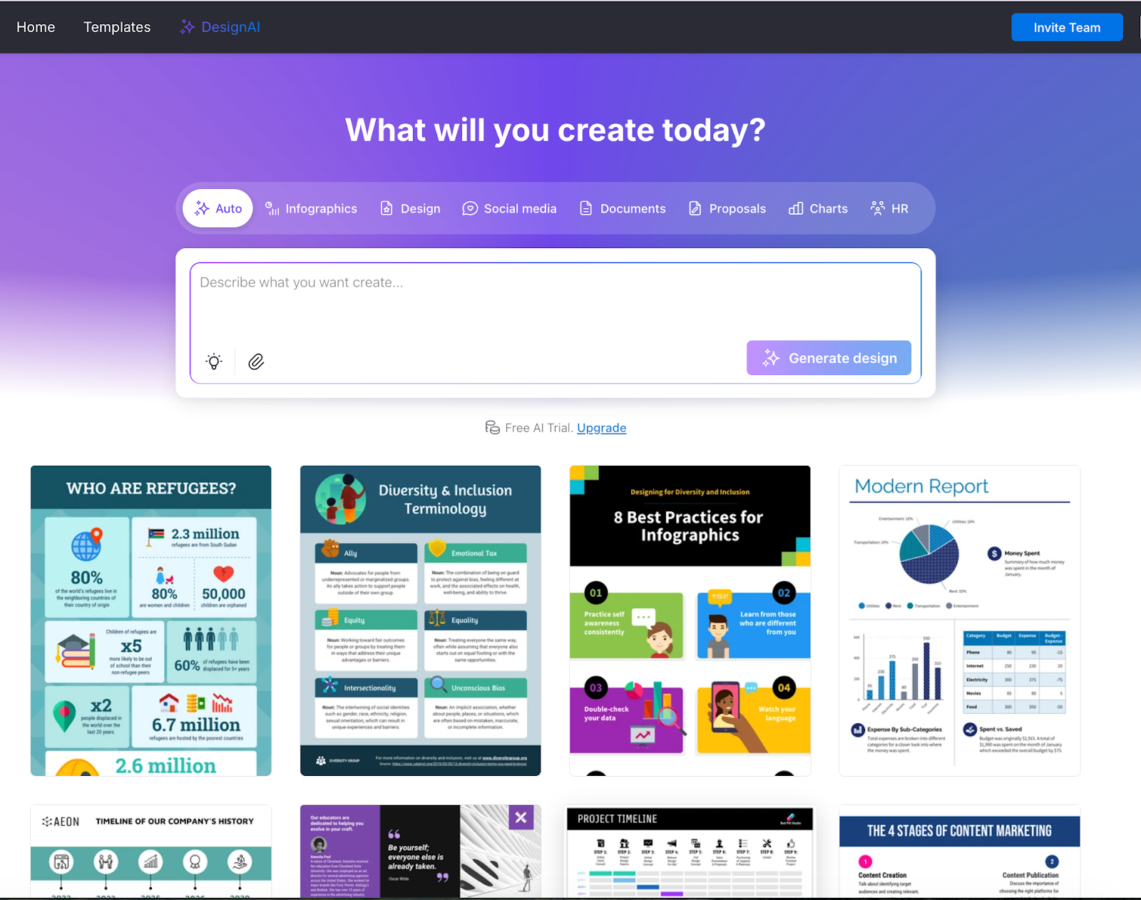 Venngage is an AI-powered design solution built specifically to solve this. You can generate professional infographics, detailed reports, process visualizations, and project timelines using simple text prompts.