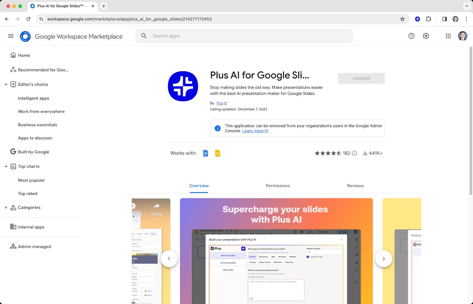 Plus AI is an add-on for Google Slides that allows users to create and edit presentations using AI. You can install the Plus AI add-on for free from the Google Workspace Marketplace.