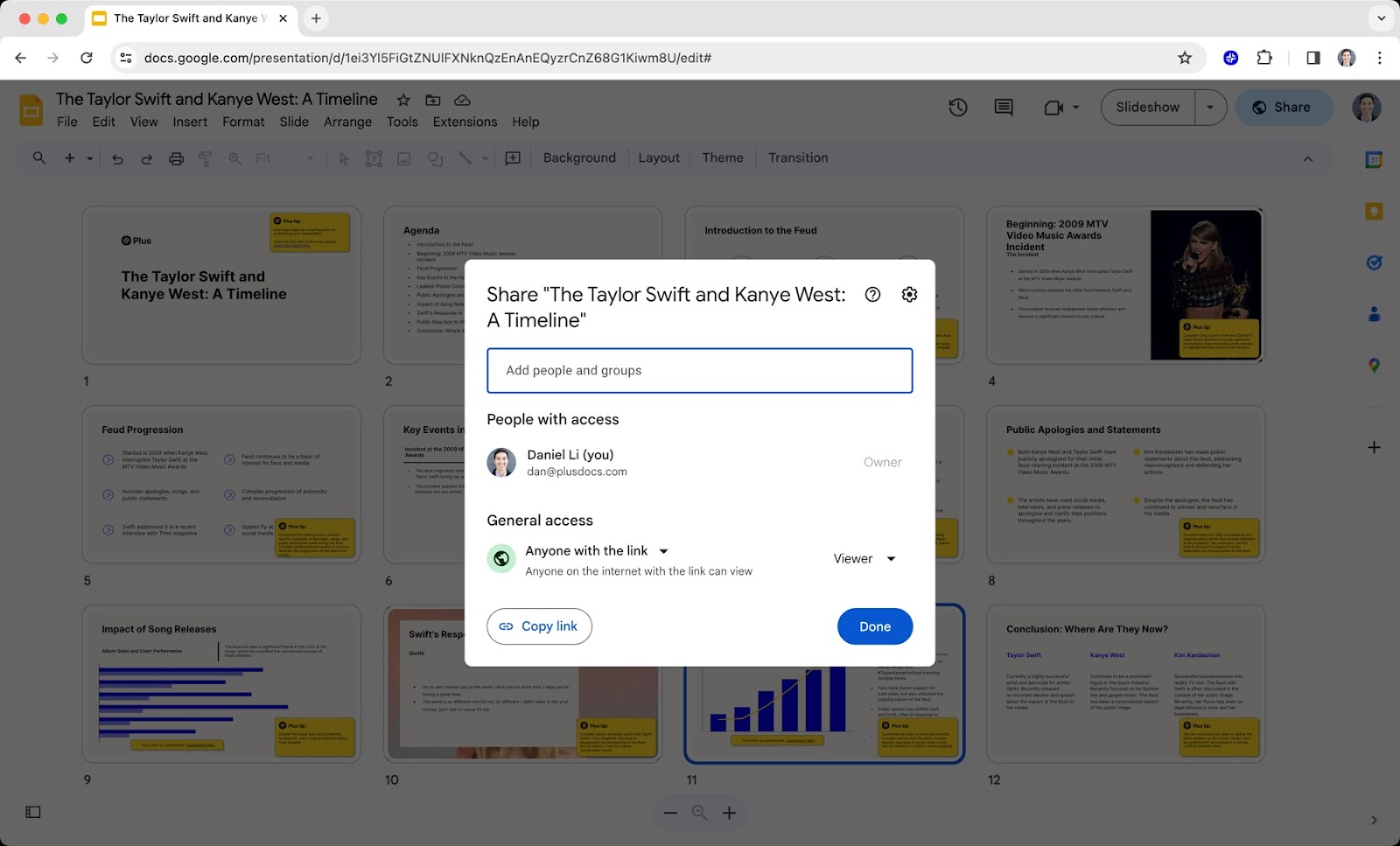 Last but not least, one of the best parts of using the Plus AI add-on is that you can continue to use all of the built-in, native features of Google Slides. This means you can collaborate on your slide deck like a typical Google Slides presentation by sharing links, allowing commenting, etc.