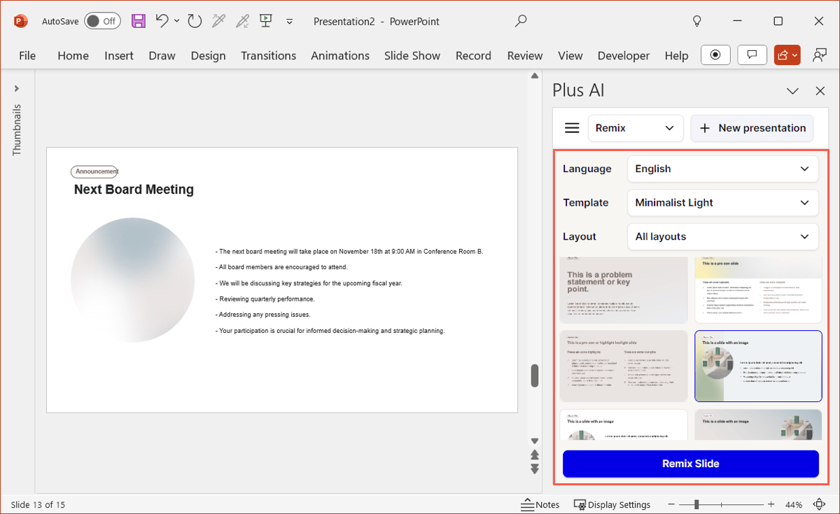 Want to format your slide and transform it into a new layout to better present your content? Plus AI comes through here too. Pick a template, choose the layout, and click Remix Slide.