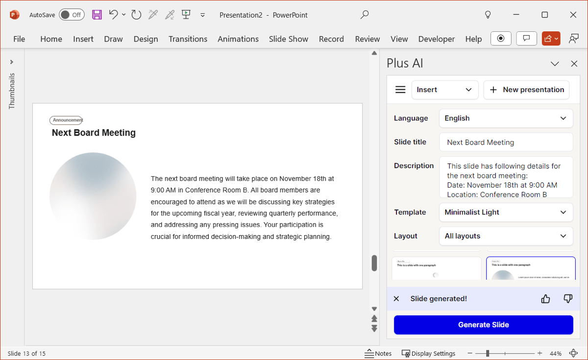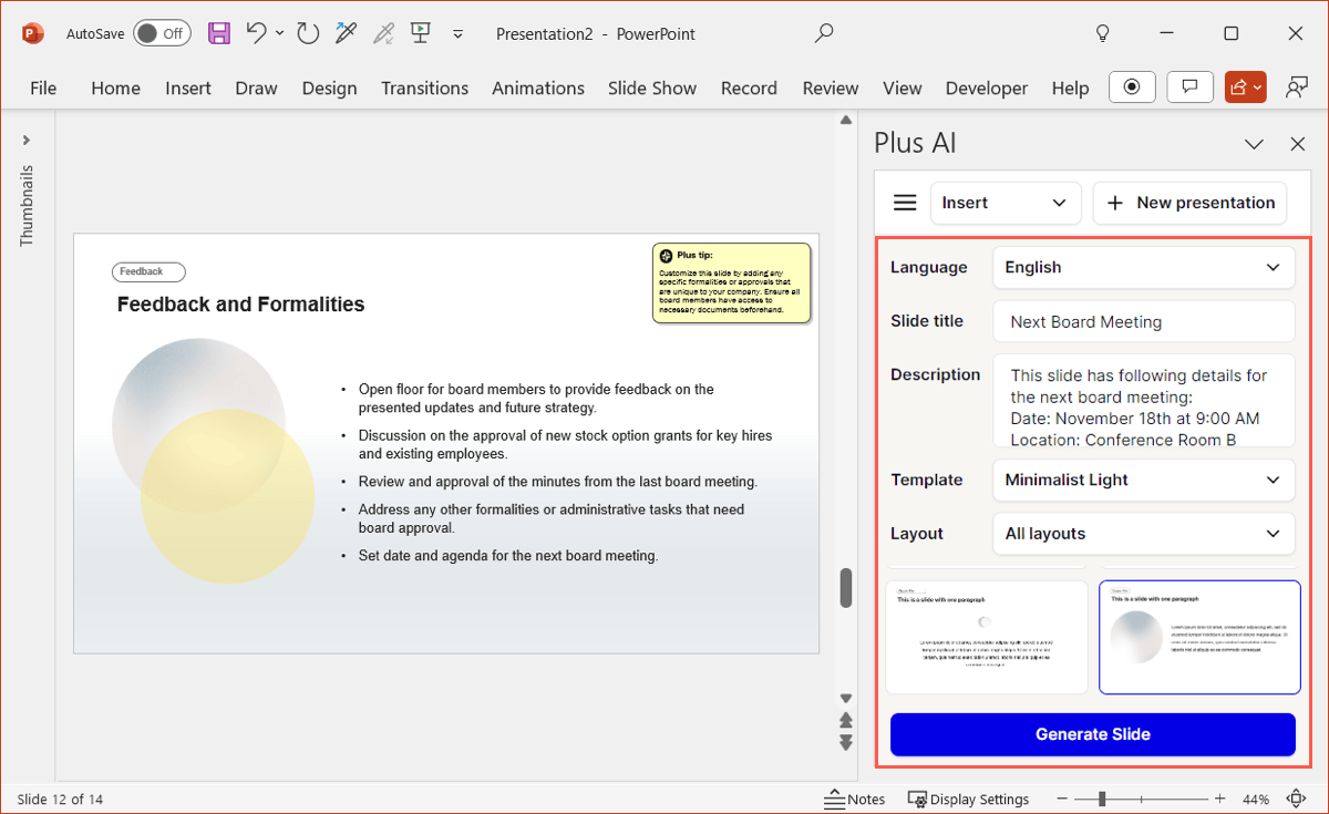 You may decide that you need another slide in your presentation and Plus AI can generate it for you. Just enter the slide title, content you want to include, and pick a template and layout.