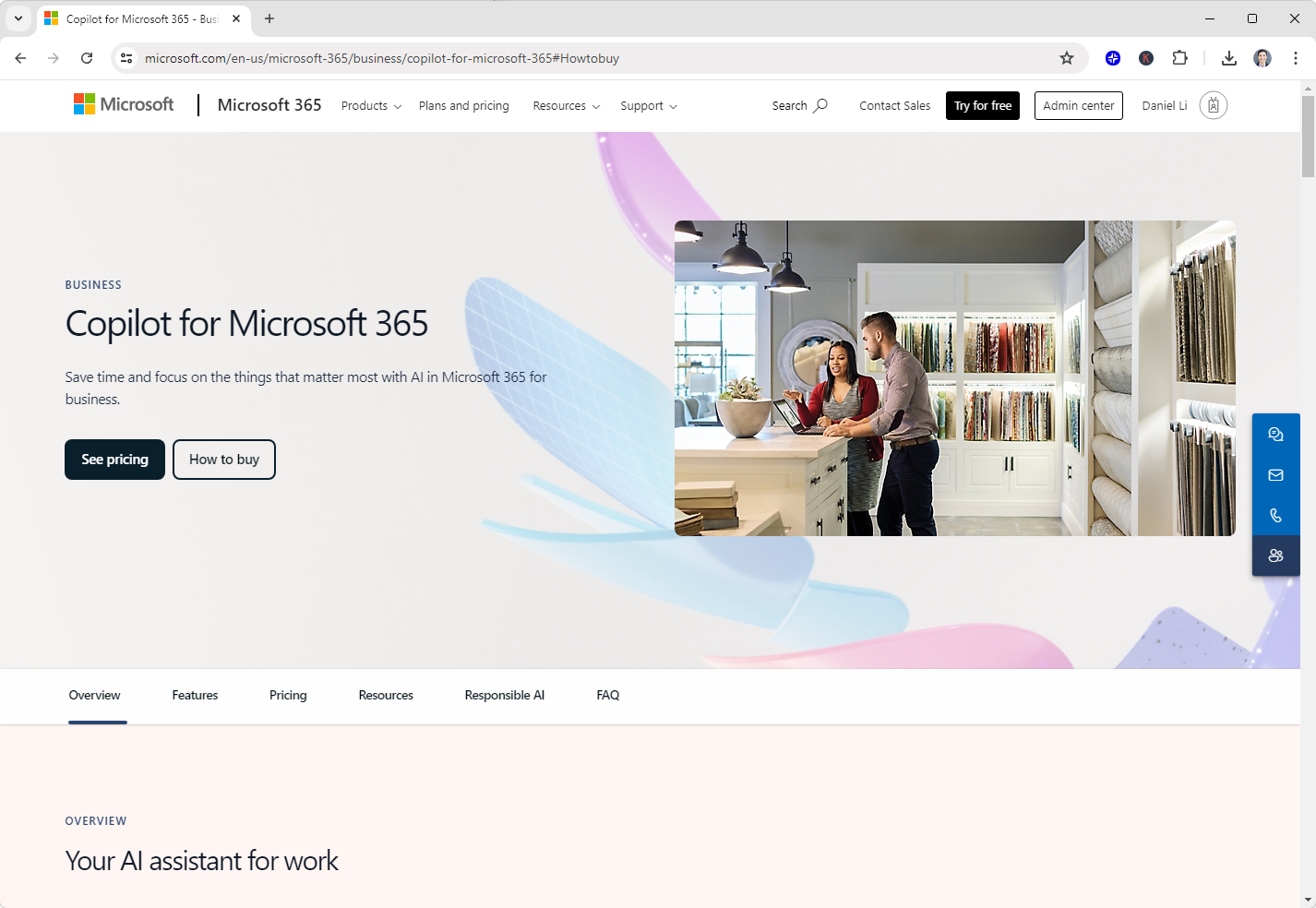 To purchase Copilot, visit the Copilot for Microsoft 365 page (not the Copilot chatbot page) and then follow the instructions to buy a license.