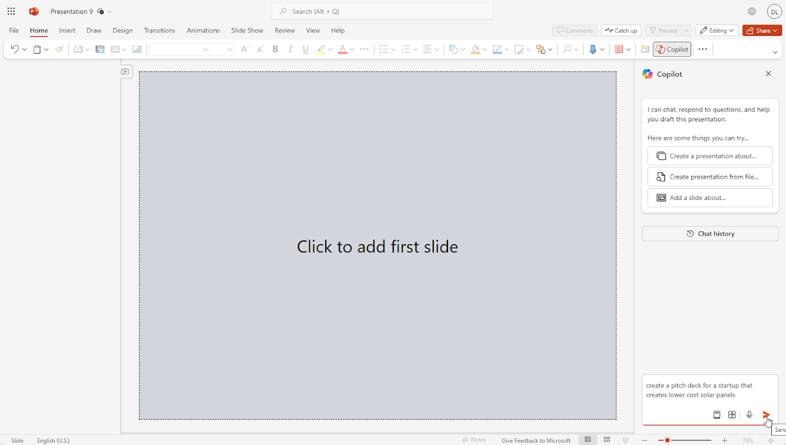 Try something like “create a pitch deck for a startup that creates lower cost solar panels,” or you can also use the suggested commands to get started on a new presentation.