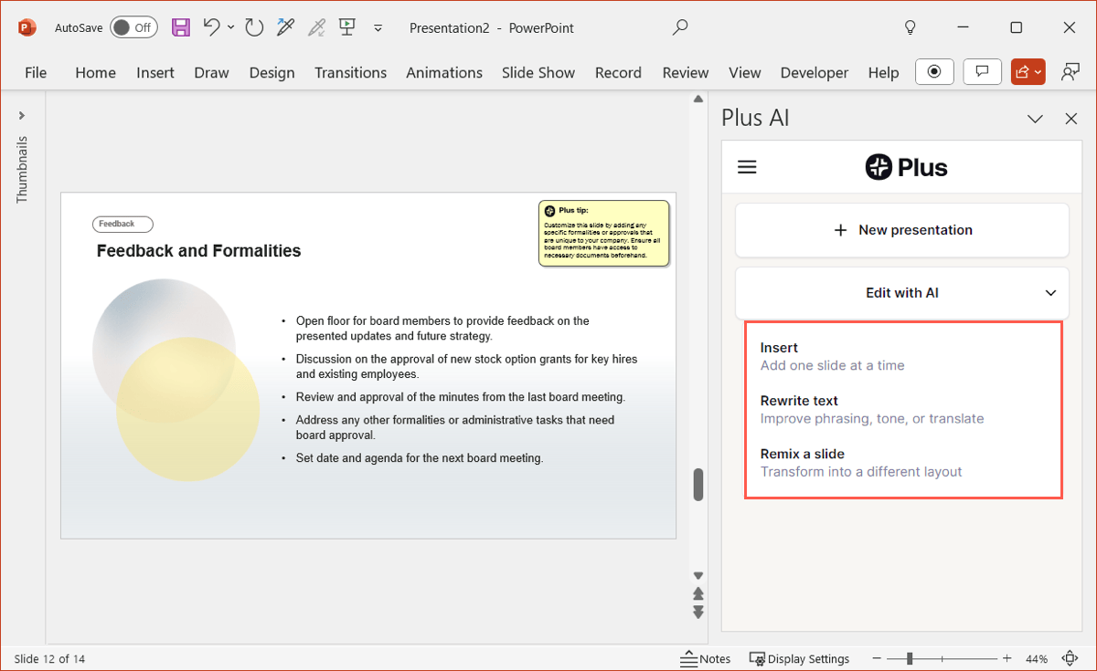 After you create your PowerPoint, or if you have an existing presentation, you can use Plus AI for PowerPoint to edit your slides. This includes adding slides and content, rewriting text, and formatting your slides.