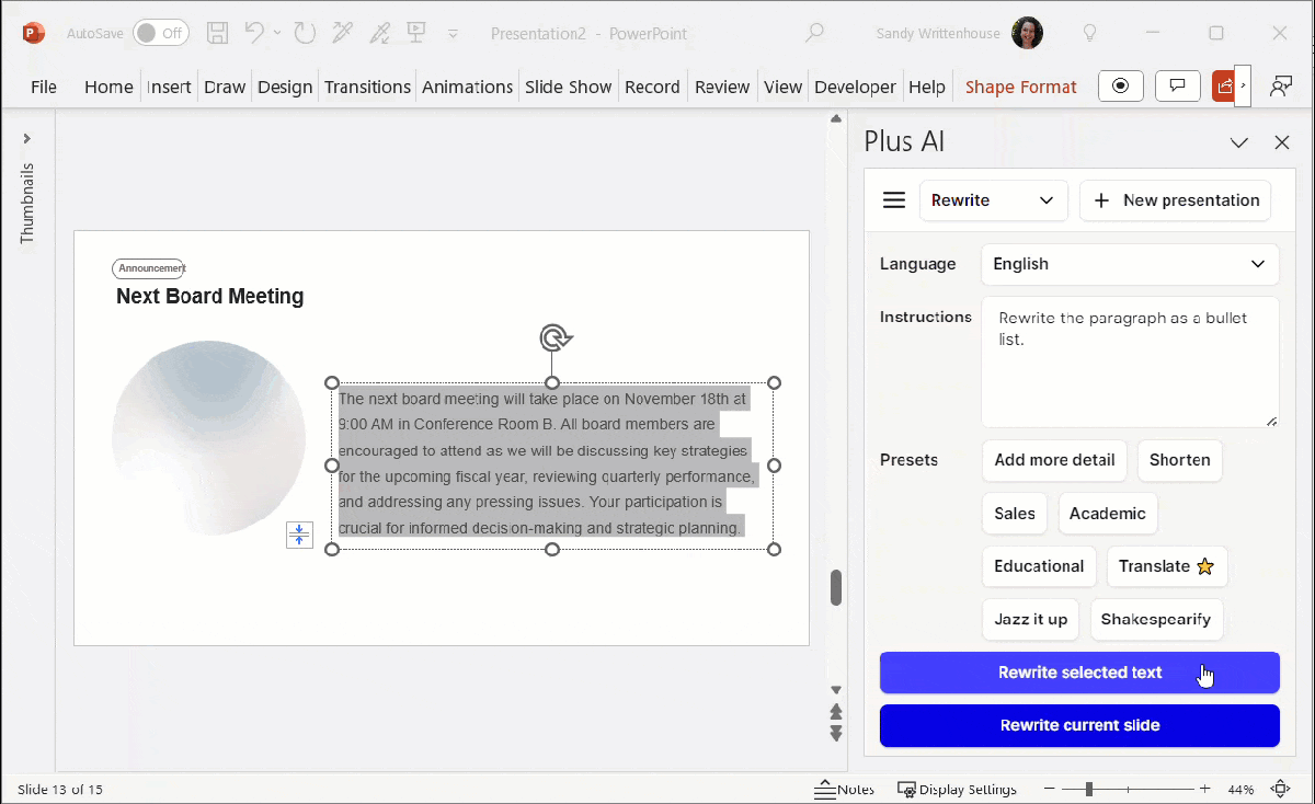 Maybe you need a bit of help rewording text or would like to format it as a list. This is no problem for Plus AI. Select your slide content, add a description of the change and optionally pick a preset, and click Rewrite selected text.