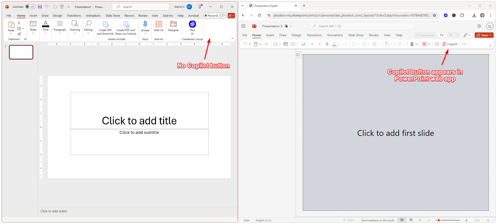 Afterwards, you may have to look in a few different places to enable Copilot. For me, the Copilot button does not appear in my desktop PowerPoint app, but it does appear in the web version of PowerPoint.